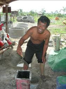 Last year, when WRF/PACE were conducting job assessments, he suggested concrete making as he could see there was a need. It was agreed and he and another villager were sent for training. WRF/PACE also provided the equipment and materials for them to get started. Sim Bung Seng, then became the supervisor, so when two more people joined the team, he was the one that trained them. Unfortunately, one of the members of the team had to leave for health reasons. He had a full leg prosthesis and found it difficult to bend. He also had other health problems.